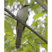 Closely related to the Yellow-billed Cuckoo but slighter in build, the Black-billed Cuckoo has a smaller, dark bill, a relatively shorter tail with less obvious white spots, and little or no reddish coloration in the wings. Both species frequent groves of hardwood trees where they tend to remain motionless in dense foliage, and are more often detected by their rather similar, loud vocalizations than by sight.