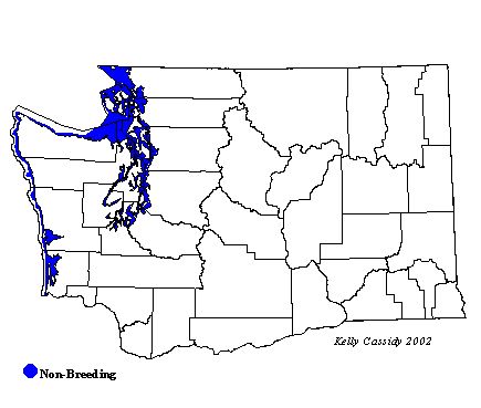 Some of the major wintering areas of Black Scoters in the West include the coastal waters off Washington, where they are widespread but not common from mid-November to mid-May. Limited numbers can also be found in the Strait of Juan de Fuca and Puget Sound. They are regularly seen at Budd Inlet in the Olympia Harbor (Thurston County) and in Penn Cove on Whidbey Island (Island County).