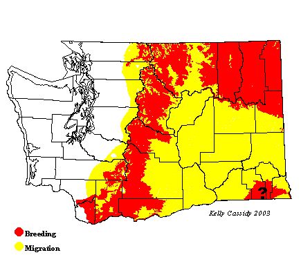 The Nashville Warbler is primarily an eastern Washington species. These birds are common in appropriate habitats throughout the eastern part of the state from mid-April to late August. In western Washington, they can be found in scattered pockets in western Clark and Skamania Counties and along the upper Skagit River (Skagit and Whatcom Counties). Some years a small number can be found migrating through western Washington. They were formerly found in the Garry oak woodlands of south Puget Sound (Pierce and Thurston Counties) as well.