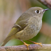 Ruby-crowned Kinglets are tiny, active, olive-green to gray songbirds. Their wings are dark, with two white wing-bars. There is a black smudge below the second wing-bar, which is a field mark useful in distinguishing a Ruby-crowned Kinglet from the similar-appearing Hutton's Vireo. Ruby-crowned Kinglets have bold, incomplete white eye-rings. Their legs are black and their feet, yellow. They are slightly larger than the closely related Golden-crowned Kinglet and lack that species' black and white head stripes. Male Ruby-crowned Kinglets have bright red crests (that can vary in color to orange), which can be raised when the bird is excited but which are more often completely hidden. Females look like males but lack the red crest.