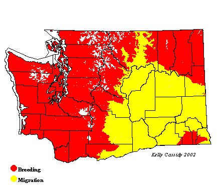 Swainson's Thrushes are highly migratory, and none winter in Washington. They arrive late in spring, and migration is spread out, with spring migrants appearing in late May in eastern Washington. Fall migration takes place during August and September. Migration is mostly at night. The birds migrate to tropical forests for the winter.