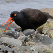 Mussels and limpets are their primary food, but Black Oystercatchers prey on a wide range of shellfish and other creatures found along the rocky shore. They locate open mussels and disable them with a quick jab to the adductor muscle. With the mussel stuck in the open position, the oystercatcher can pull out the contents with the tip of its chisel-like bill. Oystercatchers often forage in the wave zone, because mussels that are splashed by waves open more frequently.