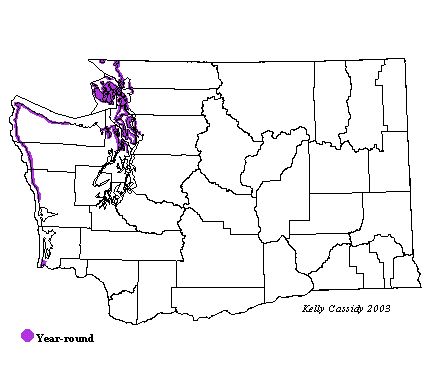 The Black Oystercatcher is seen year round in appropriate habitat along most of the outer coast of Washington, but seen only occasionally from Point Grenville, south to the mouth of the Columbia River. It can also be seen in the San Juan Islands and along the coast of Puget Sound, south to Whidbey Island (Island County). It is absent in the southern Puget Sound and in the Strait of Juan de Fuca, from the mouth of the Elwha River (Clallam County) to Protection Island (Jefferson County), due to lack of appropriate habitat. During the breeding season, Black Oystercatchers nest in about 100 different locations. They are typically found on the same islands and rocks as colonial nesting species, although they are not colonial nesters themselves. In winter, the entire population in the San Juan Islands may gather in three or four large flocks.