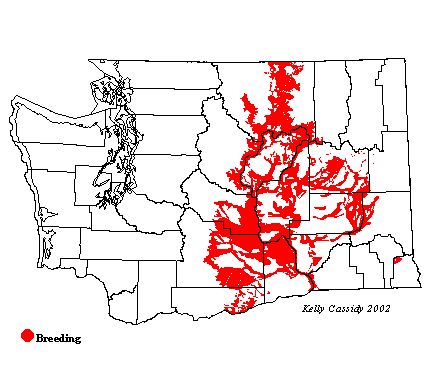 Brewer's Sparrows are common in the Columbia Basin and Okanogan Valley, especially on north slopes of east-west ridges such as Yakima, Umtanum, and Horse Heaven Ridges. They are present, but less common, in the Methow Valley and southern Columbia Basin. A small breeding population exists in remnant patches of habitat in Asotin County. They are local and rare in isolated grassland patches in the Spokane Valley (Spokane County) and Little Pend Oreille National Wildlife Refuge (Stevens County).