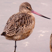 Marbled Godwits are large shorebirds with slightly upturned bills. They are mottled brown with cinnamon underwings that are distinctive in flight. In winter, they are plain underneath, but during the breeding season they have dark barring on their breasts and bellies.