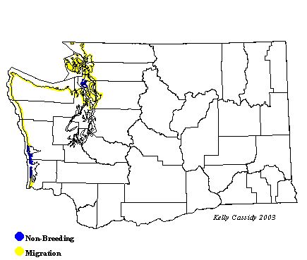 While a few Ruddy Turnstones sometimes winter at Coupeville on Whidbey Island (Island County) and in Willapa Bay (Pacific County), they are predominantly migrants in Washington. They are most common in spring, from late April through May, when they are common on the outer coast and uncommon on the protected shores of Puget Sound and the Strait of Juan de Fuca. Migrants are less common in fall than in spring, but they are still fairly common. Adults come through from mid-July to early August, and juveniles follow from late August to late September.