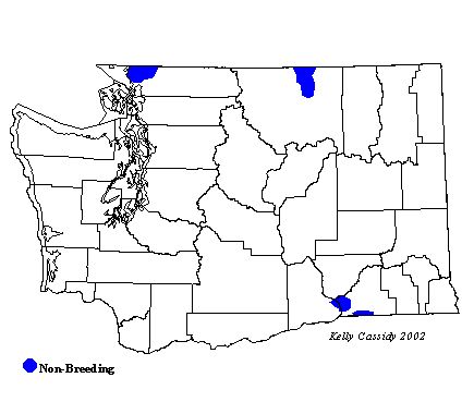 Rusty Blackbirds are rare but regular fall and winter visitors throughout lowland Washington. Birds have been seen in Whatcom, Snohomish, Clark, Thurston, King, and Okanogan Counties, and are found annually in the Walla Walla area. They breed as far south as southern British Columbia, but are more common breeders in the central interior part of that province.