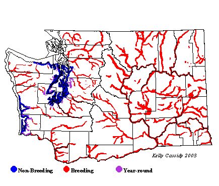 Common breeders from May through September all over the state, Spotted Sandpipers are less common at higher elevations. Most are gone by November, although a small number winter in both fresh and salt water in Washington, mainly near the coast and in Puget Sound, in most years. Examine the edges of freshwater streams, sewage ponds, and agricultural ponds to find them.