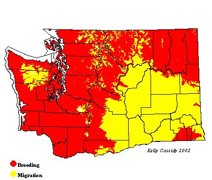 Western Tanagers are widespread throughout Washington between May and September. They are quite common in forested areas of eastern Washington, especially in Ponderosa-pine and Douglas-fir forests. They are uncommon in highly developed areas as breeders. They are common in the Puget Trough lowlands during migration. Some rarely linger into early winter, apparently more in recent years.