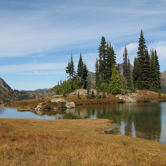 Eleven miles due east of Mount Rainer is the Naches Peak area on the crest of the Cascades Mountains. It ranges in elevation from 5,000 to 7,000 feet and lies under a heavy snow pack from late fall to late June. This is a subalpine plant community of wildflowers, Pacific silver, noble, and subalpine firs. Periodic lighting strikes have burned the area and created meadows filled with summer wildflowers. The exposed south-facing slopes have well-drained soils and a snow pack that melts out much earlier than the contrasting wet, cooler, north-facing slopes. Avalanche chutes and rocky talus slopes scar the peaks. Several small tarns or lakes are found throughout the area. The wilderness is extensive, with contiguous tracts of old-growth forest from the lower reaches around 2,000 feet to the subalpine.