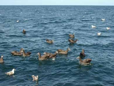 Peak birding time off Washington's coast is April through October. Species breeding in all corners of the Western Hemisphere spend some or all of this time feeding in the productive waters off our coast. Sooty Shearwaters (from New Zealand) occur in flocks of thousands, often with Pink-footed Shearwaters (from Chile) mixed with them. Black-footed Albatrosses (from Hawaii) are attracted to fishing boats where they feed on bycatch. Pomarine Jaegers, Long-tailed Jaegers, Sabine's Gulls, and Red Phalaropes (all from the Arctic) are migrants through the pelagic zone, and in late summer one encounters small numbers of South Polar Skuas (from Antarctica). Several species that breed in Washington, such as Fork-tailed Storm-Petrels and Cassin's Auklets, feed in pelagic waters, spending several days feeding offshore before they return to their burrows to feed their young.